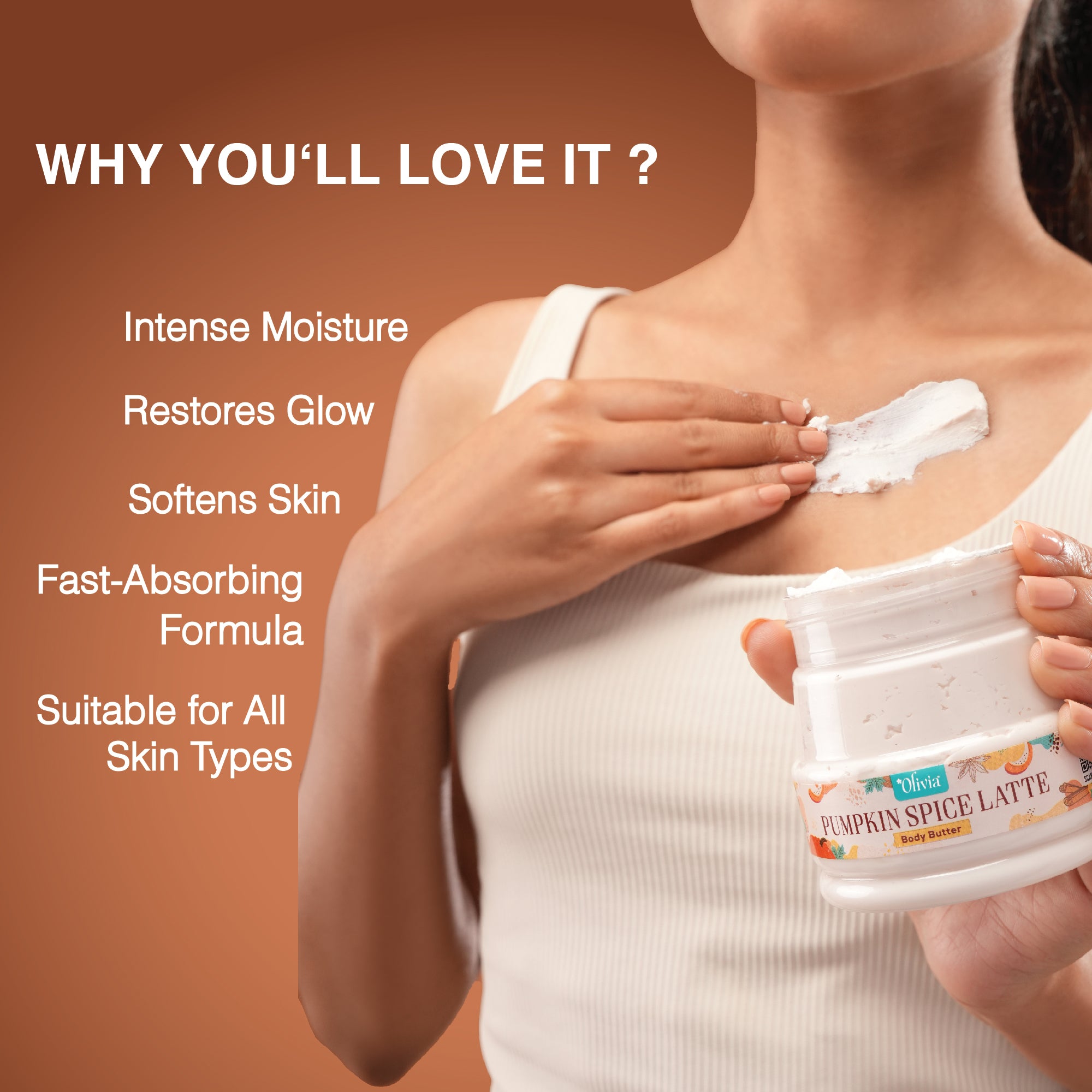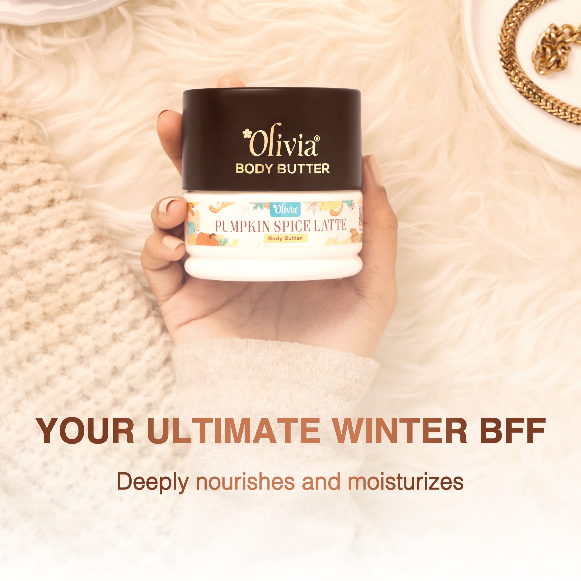 Indulge in the cozy embrace of autumn with Olivia Pumpkin Spice Latte Body Butter, a luxurious treat for your skin. Infused with the warm, comforting essence of pumpkin spice latte, this rich and creamy body butter deeply nourishes and hydrates, leaving your skin irresistibly soft and smooth. Its velvety texture melts effortlessly into the skin, providing long-lasting moisture without feeling greasy. Formulated with a blend of natural ingredients, this body butter helps restore skin elasticity, enhance hydration, and protect against dryness. The indulgent aroma of pumpkin, cinnamon, and vanilla creates a spa-like experience, making it the perfect addition to your self-care routine. Whether you’re wrapping yourself in cozy layers or simply looking for a seasonal skincare delight, Olivia Pumpkin Spice Latte Body Butter envelops you in warmth and nourishment. Pamper yourself with this fall-inspired skincare essential and experience the ultimate hydration with every application. Perfect for daily use, it provides a soothing, comforting touch that lingers throughout the day. Treat your skin to the magic of autumn—because every season deserves a little extra indulgence. Embrace the essence of fall, one pampering layer at a time.